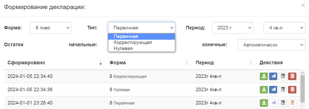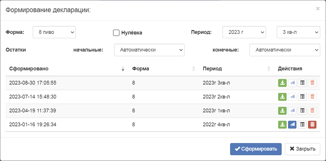 | id | fname | Сформировано | Отправлено | Форма | Тип | Период | Действия |