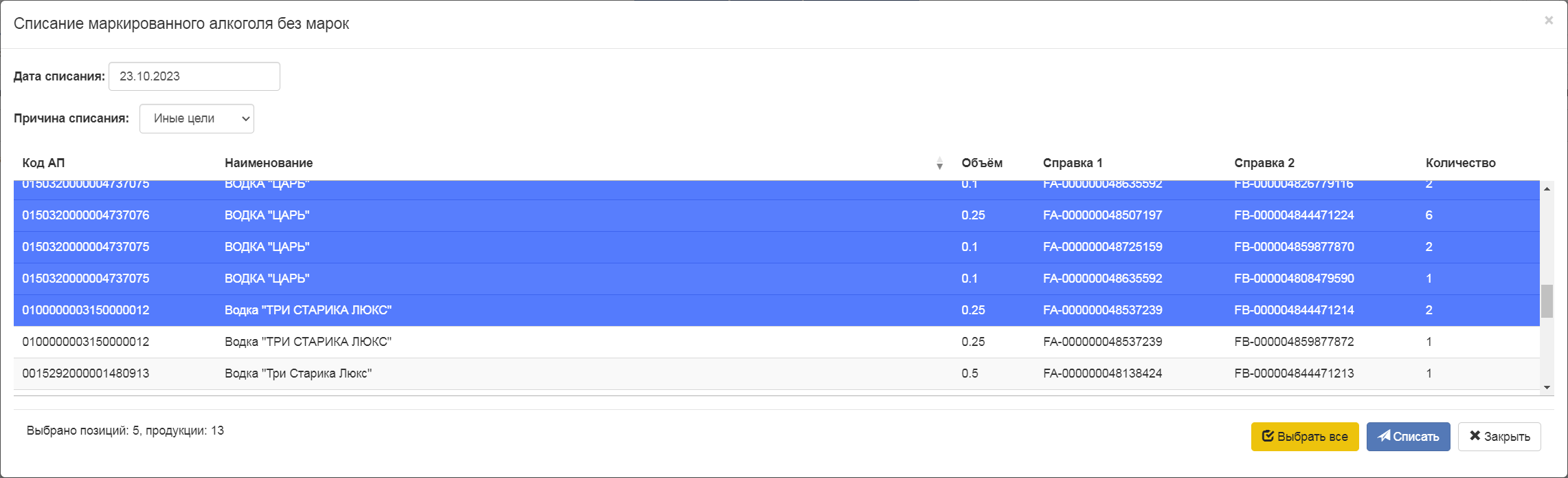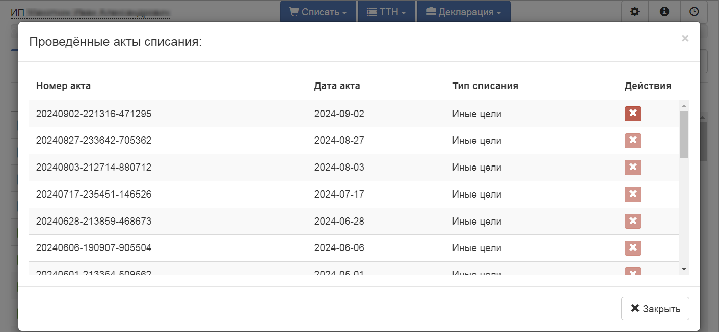 | id | send | Номер акта | Дата акта | Тип списания | Действия |